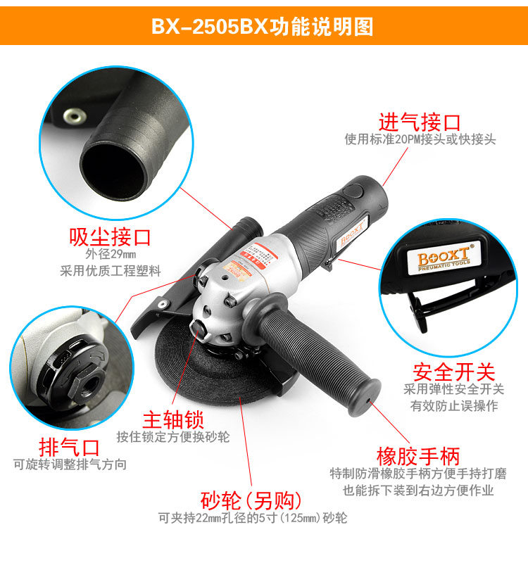 東莞市強勁五金工具有限公司提供臺灣BOOXT波世特品牌氣動工具,吸塵氣動角磨機BX-2505BX廠家直銷,首件享特價。