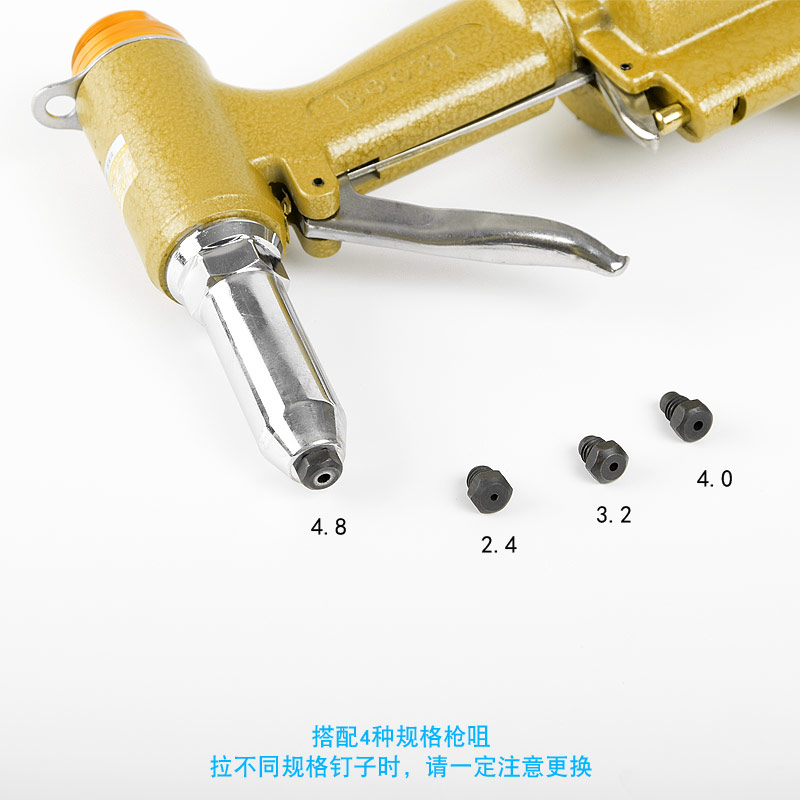• 產品參數: 拉釘規格:2.4-4.8(鋁釘/鐵釘);行程:16mm;最大拉力:2304lbs(1045kgf);全長:270mm;重量:1.6kg;噪音值:87dB(A);耗氣量:0.21立方米/分鐘;使用工作氣壓:0.65Mpa;推薦使用內徑8mm氣管